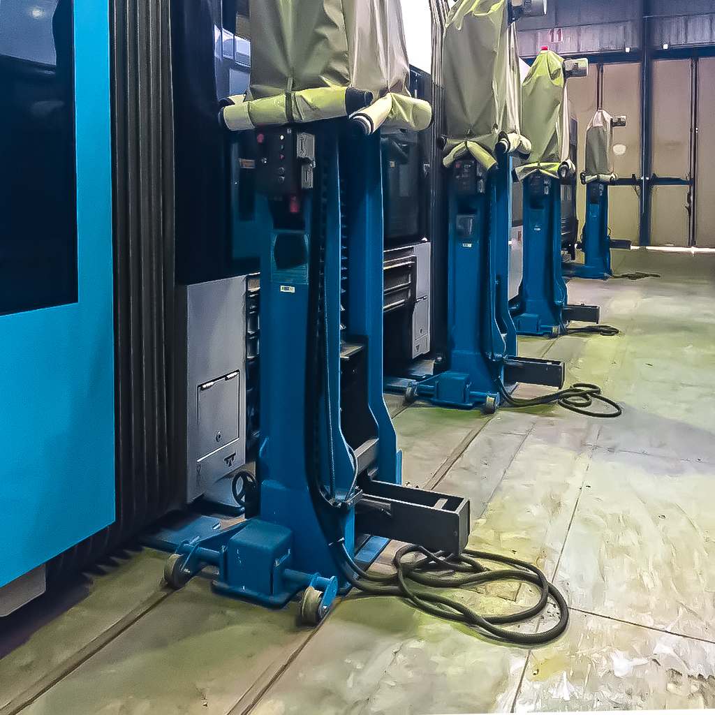 جک بالابر واگن: این دستگاه معمولاً شامل چندین ستون هیدرولیکی است که با بالا بردن همزمان، واگن را از زمین بلند میکنند. جکهای بالابر واگن در ظرفیتهای مختلف برای بالا بردن انواع واگن ساخته میشوند.